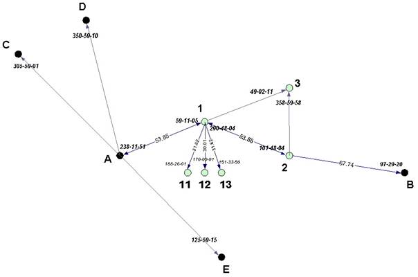 Első ránézésre megállapítható, hogy az A és B pontok között egy sokszögvonalat vezettünk, az 1-es pontról polárisan meghatároztuk a 11-13. pontokat, illetve az 1-es és 2-es pontok segítségével meghatároztuk a 3-as pontot tájékozó irányok segítségével.